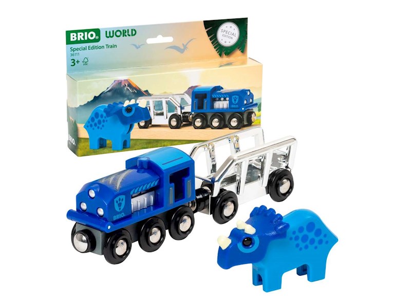 Der Sondereditionszug (2025) ist eine fantastische Ergänzung zu jeder BRIO World Eisenbahn. Der Dinosaurierzug fällt durch sein Finish in Silber und Blau und eine seltene blaue Triceratops-Figur auf. Bei geöffneter Haube ist der Motor im Inneren zu sehen. Ist das letzte Feintuning erledigt und der Dinosaurier aufgeladen, kann es losgehen. Dieser Zug in limitierter Auflage ist nur im Jahr 2025 erhältlich.